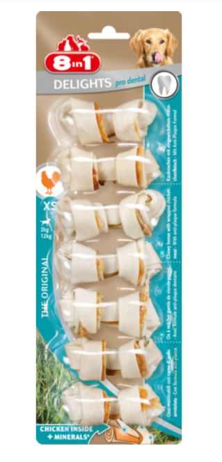 Des os à mâcher avec de la viande de poulet pour des soins dentaires supplémentaires. Un en-cas unique et breveté qui prend soin des dents, réduit la plaque dentaire et prévient la formation de tartre, et satisfait l'instinct naturel de mastication du chien.