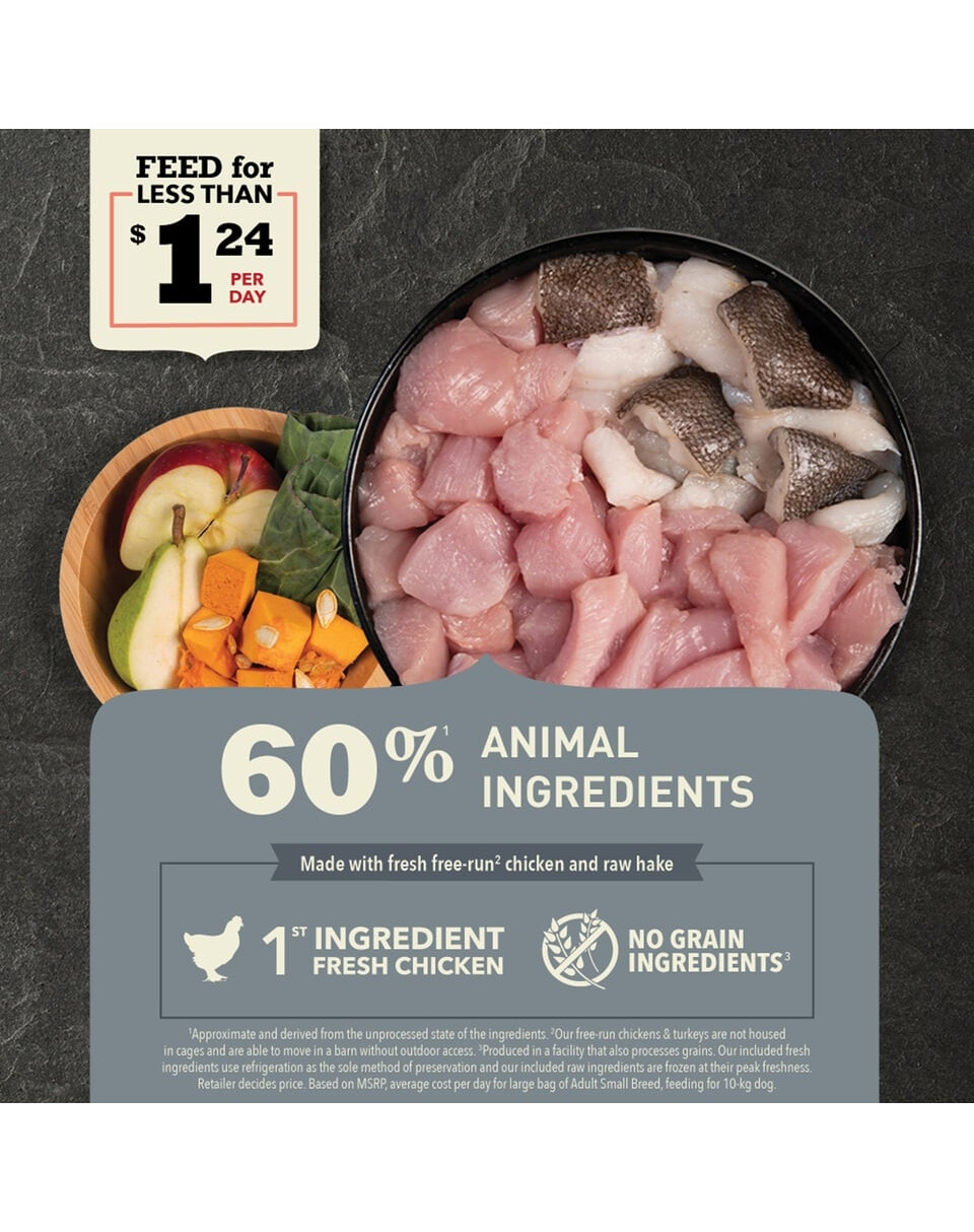Viande de poulet fraîche (16%), poulet déshydraté (15%), lentilles rouges entières, pois verts entiers, pois chiches entiers, dinde déshydratée (4,5%), graisse de poulet (4%), organes de poulet frais (foie, cœur) (4%), hareng déshydraté (4%), œufs (4%), flrits bruts (4%), huile de poisson (4%), lentilles vertes entières, pois jaunes entiers, fibres de pois, amidon de pois, foie de dinde brut (0,5%), sel, varech séché, potiron entier frais, pastèque entière fraîche, carottes entières fraîches, pommes entières fraîches, poires entières fraîches, courgettes entières fraîches, racine de chicorée séchée, chou frisé frais, épinards frais, feuilles de navet fraîches, feuilles de betterave fraîche, airelles entières fraîches, myrtilles entières fraîches, amélanches entières fraîches, curcuma, chardon marie, racine de bardane, lavande, racine de valériane, églantier.