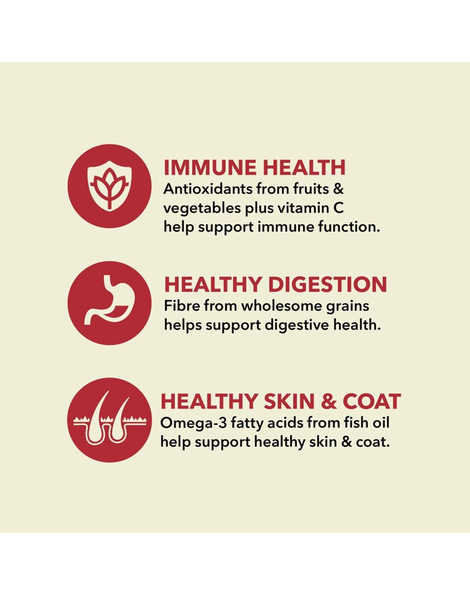 Acana Red meat contient de l'huile de poisson, qui fournit des acides gras insaturés. Ceux-ci sont essentiels au bon fonctionnement des systèmes circulatoire et nerveux, ainsi qu'à une peau et un pelage sains et résistants.