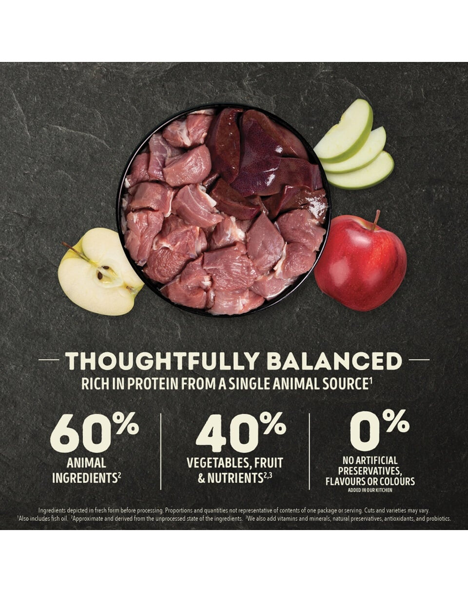 Agneau cru (18%), agneau déshydraté (18%), pois verts entiers, lentilles rouges entières, foie d'agneau cru (4%), graisse d'agneau (4%), pommes rouges délicieuses fraîches (4%), Pois chiches entiers, lentilles vertes entières, pois jaunes entiers, estomacs d'agneau crus (2%), rognons d'agneau crus (2%), cartilage d'agneau déshydraté (2%), fibres de lentilles, algues marines (1.2%) - source de DHA et EPA, citrouille musquée entière fraîche, citrouille entière fraîche, varech brun séché, foie d'agneau lyophilisé (0,1%)
