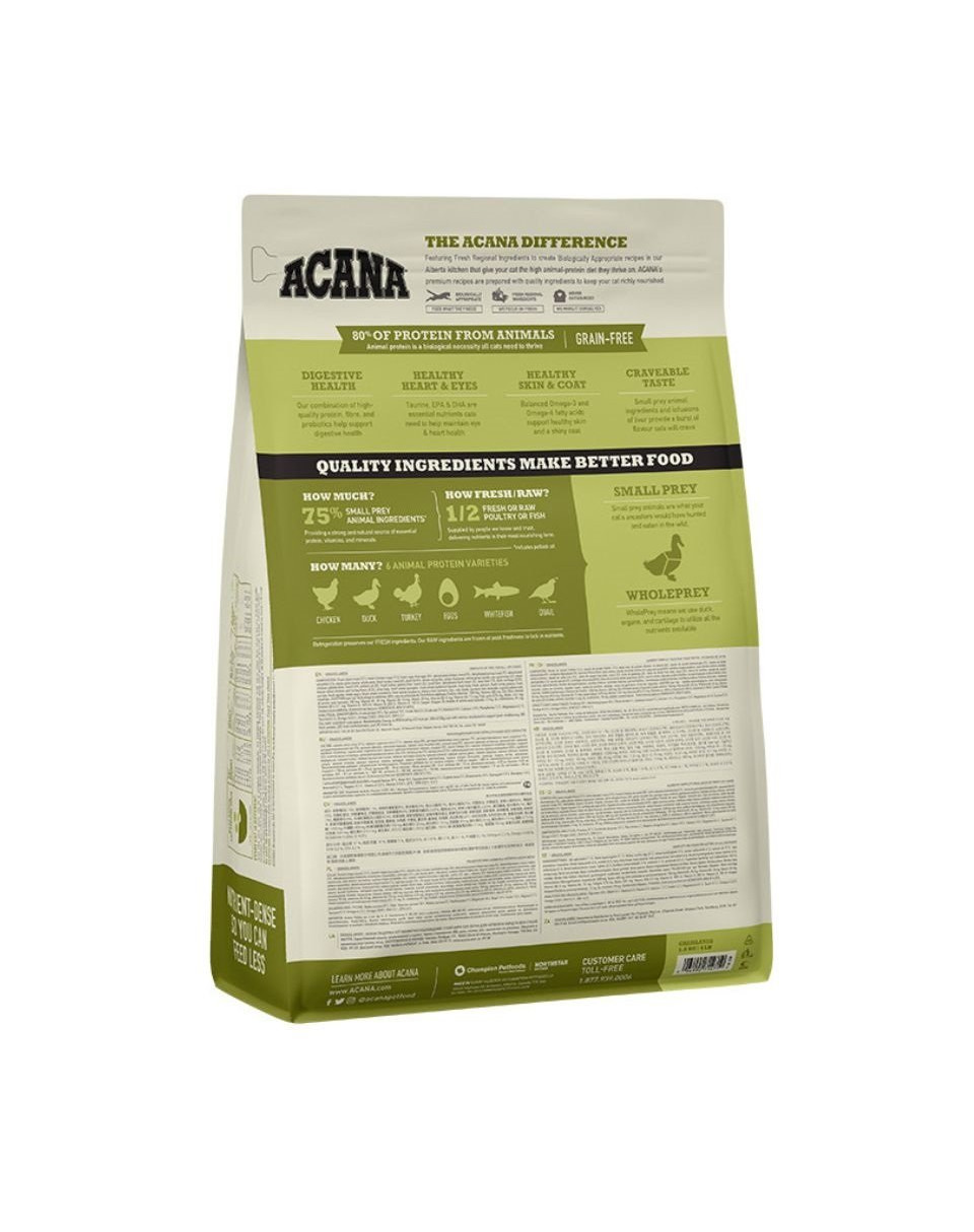 Tous les aliments Acana s'efforcent de reproduire le régime naturel des chats ancestraux et sont basés sur les connaissances actuelles des préférences des carnivores. Ils sont caractérisés par des proportions de proies entières. Ils sont basés sur un mélange de différentes sources de protéines animales, avec l'ajout de légumes et de fruits, d'herbes et d'un lien avec les hydrates de carbone - lentilles, pois chiches. Par conséquent, les aliments contiennent une quantité limitée de glucides, la plus faible de tous les aliments secs, soit environ 25 %. En même temps, ils n'irritent pas l'estomac des chats et ne perturbent pas le processus de digestion. Le faible indice glycémique réduit le risque d'obésité et ne provoque pas de pics de glycémie. La nourriture contient de la viande, des organes et du cartilage, reflétant l'organisme entier d'un animal chassé par un prédateur.