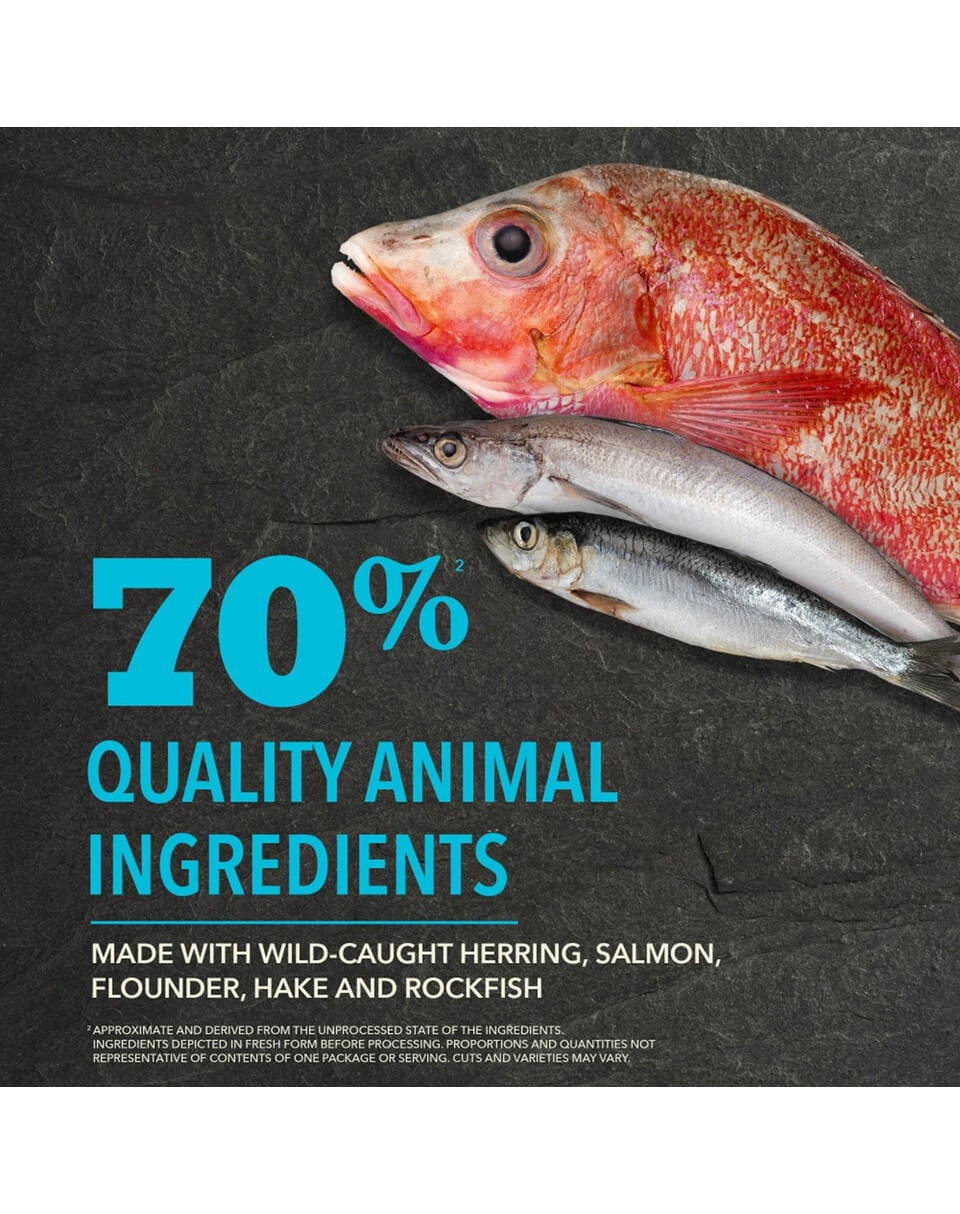 Hareng entier cru (14 %), maquereau entier cru (11 %), plie crue (9 %), hareng déshydraté (7 %), maquereau déshydraté (7 %), merlan bleu déshydraté (7 %), petits pois entiers, lentilles rouges entières, pois chiches entiers, lentilles vertes entières, huile de poisson (6 %), merlu entier cru (4,5 %), sébaste entier cru (4,5 %), haricots Pinto entiers, pois jaunes entiers, amidon de pois, huile de tournesol, fibres de lentilles, varech séché, morue et foie lyophilisés, citrouille entière fraîche, courge musquée entière fraîche, carottes entières fraîches, pommes entières fraîches, poires entières fraîches, courgettes entières fraîches, racine de chicorée, chou frisé frais, épinards frais, feuilles de navet fraîches, feuilles de betteraves fraîches, canneberges entières, myrtilles entières (bleuets), baies de Saskatoon entières, curcuma, racine de curcuma, chardon marie, lavande, racine de guimauve, fruits de l’églantier.