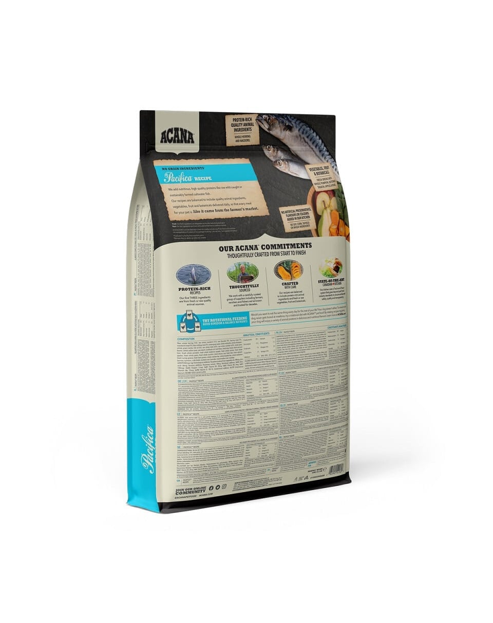 L’énergie métabolisable est de 3850 kcal/kg (462 kcal par tasse de 250 ml/120 g), dont 36 % issus de protéines, 24 % de glucides et 40 % de matières grasses. La recette ACANA Pacifica est formulée pour répondre aux niveaux nutritionnels établis par la FEDIAF pour les chiens de tout âge, y compris les chiens de races de grande taille.