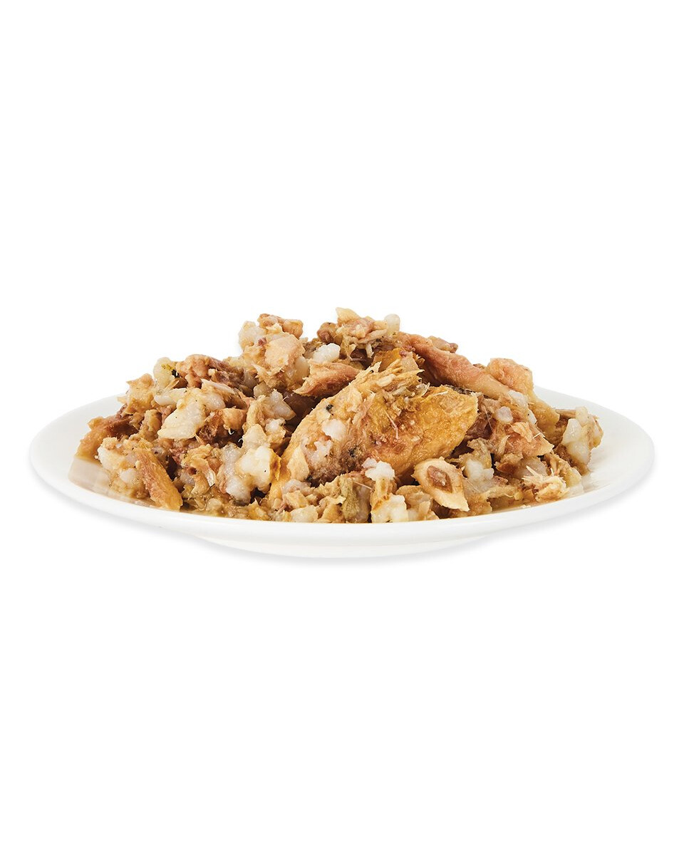 Maquereau 70%, Sardine 5%, Bouillon de poisson 24%, Riz 1%. Sans additifs.