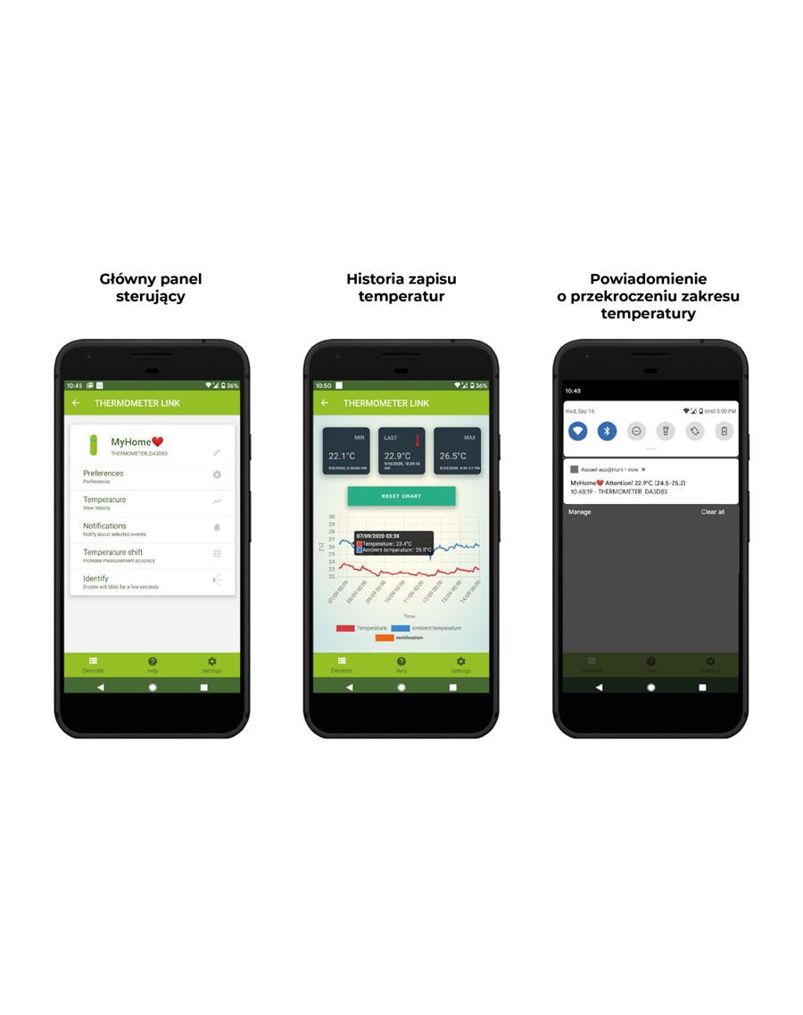 Pratique, le thermomètre vous permet de définir la plage de température souhaitée (minimum et maximum). En cas de dépassement, l'application envoie des notifications d'alarme. L'appareil a la capacité d'enregistrer et d'archiver les températures à l'intérieur et à l'extérieur du bac.