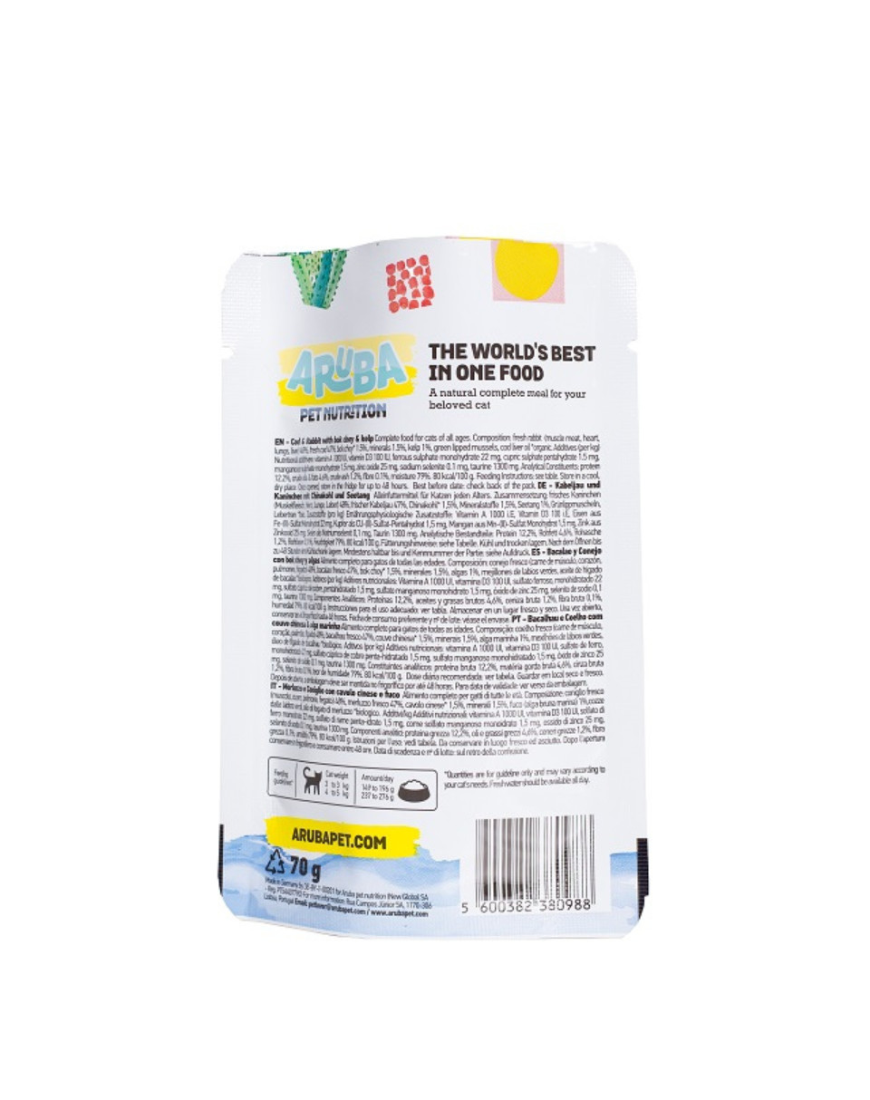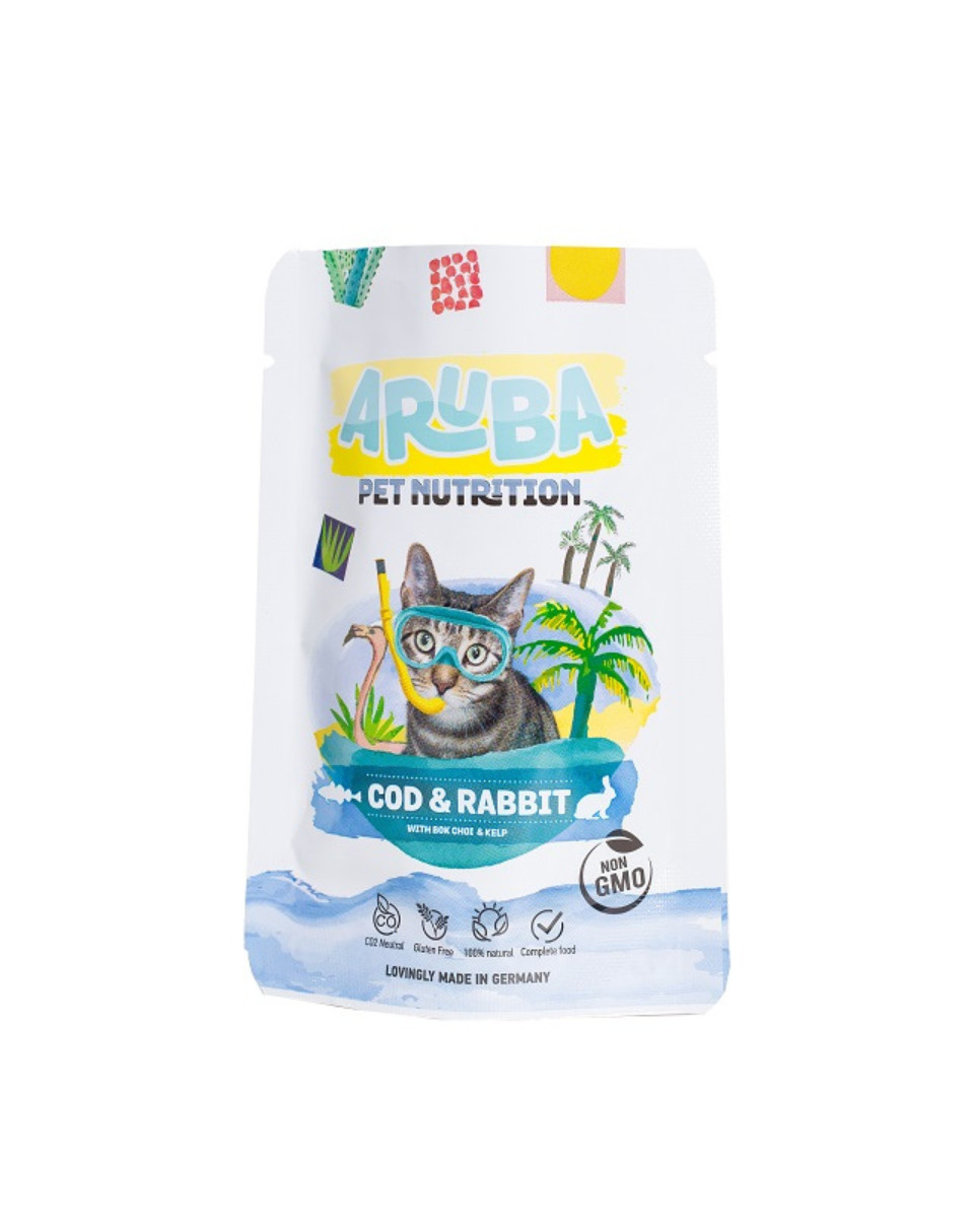 La recette de morue et de lapin d'Aruba contient également de petites quantités de varech, une grande algue brune connue pour soutenir le système glandulaire et le métabolisme de votre chat, et de l'huile de foie de morue. Serez-vous surpris si votre chat se met à miauler Arubaaaaaaa ?
