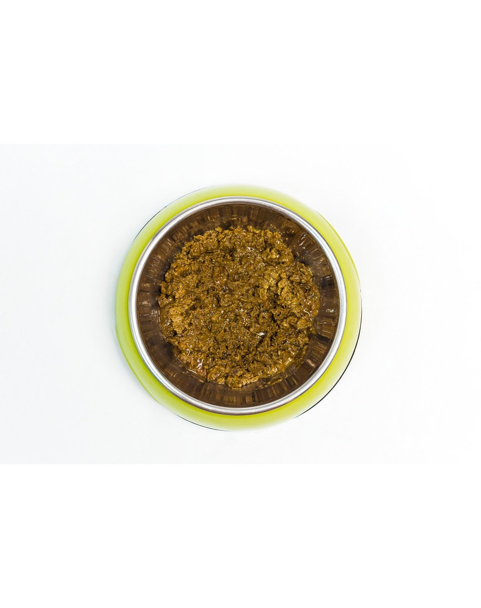 Ingrédients: lapin frais (viande musculaire, cœur, poumons, foie) 48%, cabillaud frais 47%, bok choy* 1,5%, minéraux 1,5%, varech 1%, palourdes vertes, huile de foie de morue *organique.