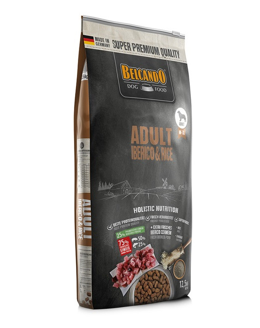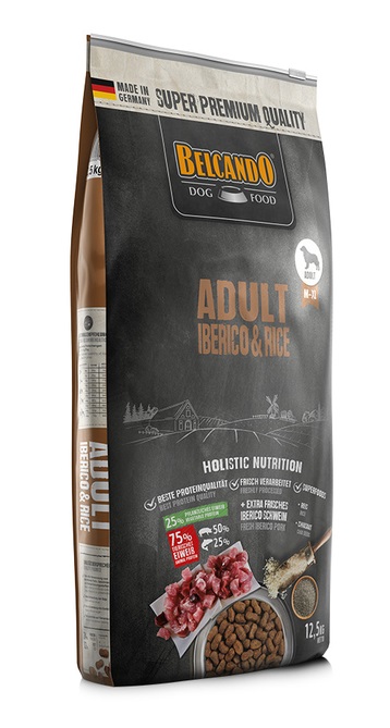 Porc frais, foie, rate, reins de porc ibérique (30%) ; riz (29%) ; protéines de porc ibérique, séchées (12,5%) ; farine de poisson marin (9%) ; farine d'avoine fourragère ; farine de pois ; levure de bière séchée ; gousses de caroube, séchées ; farine de pois (Vicia faba) ; tourteau de pépins de raisin ; graines de chia (1,5%) ; huile de saumon (1,5%) ; levure, hydrolysée ; graines de lin ; huile de carthame (1%) ; phosphate bicalcique ; chlorure de sodium ; chlorure de potassium ; herbes, séchées (total : 0,2%;feuilles d'ortie, racine de gentiane (gentiane), centurie, camomille, fenouil, carvi, gui, achillée, mûre) ; yucca californien.