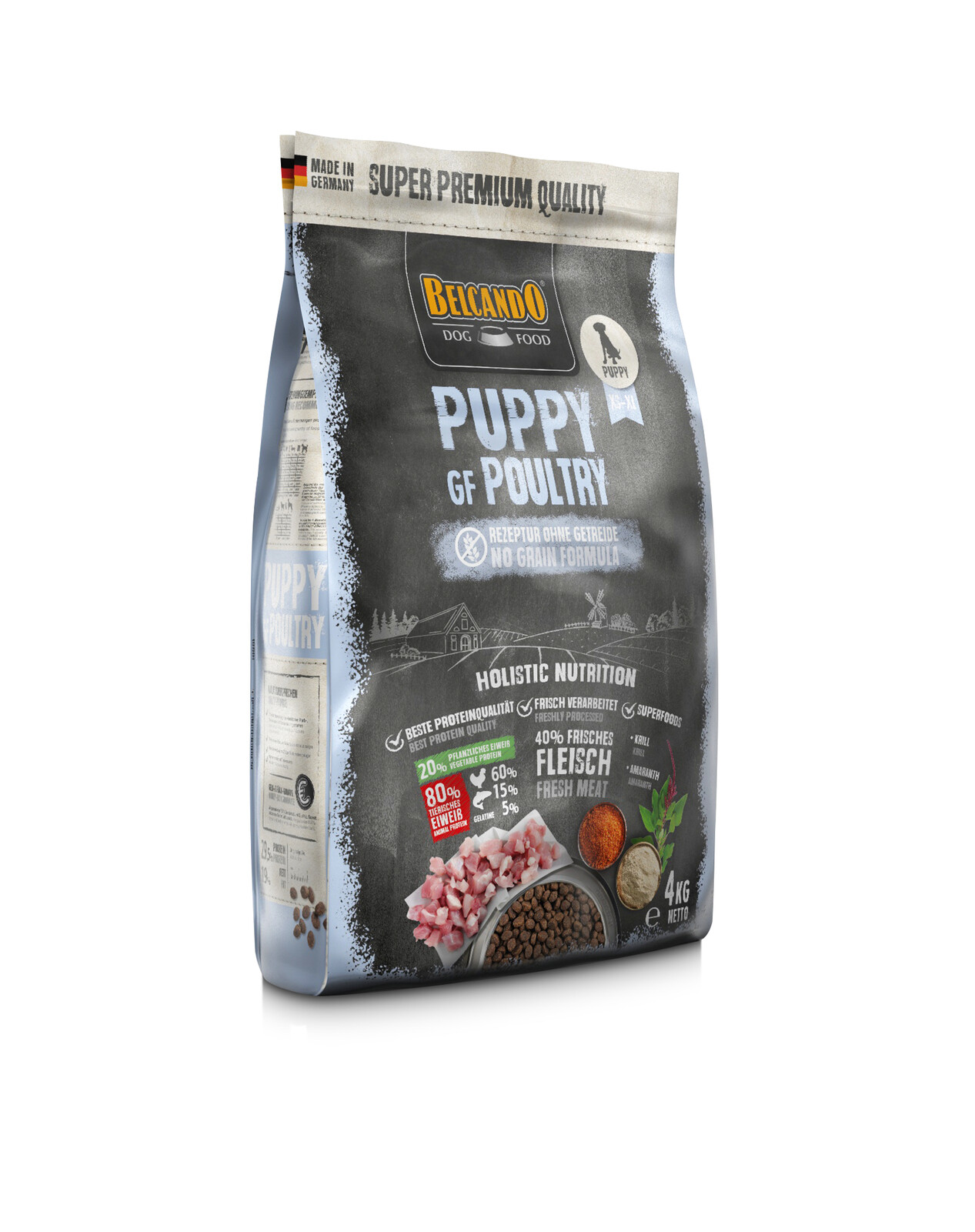 Viande fraîche de volaille (40%) ; protéines séchées de volaille à faible teneur en cendres (16%) ; amarante (14%) ; fécule de pomme de terre ; farine de pois ; farine de poisson marin (5%) ; graisse de volaille ; zooplancton marin, broyé (krill, 2,5%) ; gélatine, hydrolysée (2,5%) ; Levure de bière, séchée (2,5%) ; oeuf sec ; gousses de caroube, séchées; pulpe de betterave séchée, sans sucre ; phosphate dicalcique ; huile de saumon ; foie de volaille hydrolysé ; graines de chia ; chlorure de sodium ; chlorure de potassium.