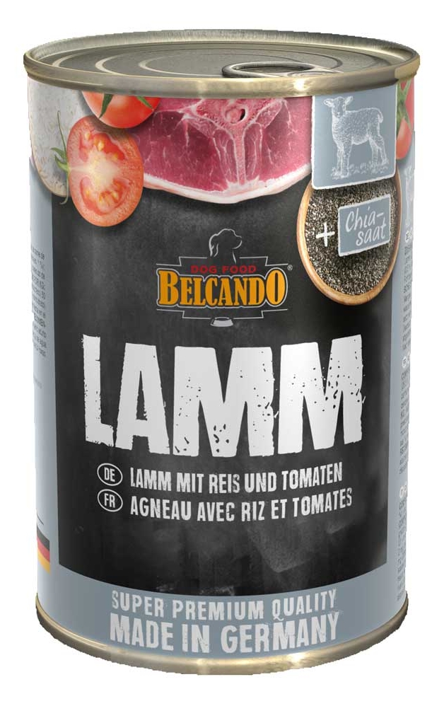 Agneau, panse d'agneau, foie, cœurs, langues (63 %) ; bouillon d'agneau (26,5 %) ; riz, cuit (4 %) ; tomates (4 %) ; graines de chia (1 %) ; minéraux (1 %) ; huile de carthame (0,5 %).