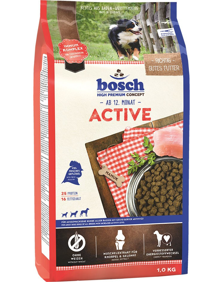 Aliment sec et complet pour les chiens adultes physiquement actifs. Également recommandé pour les jeunes chiens qui ont atteint l'âge adulte, mais qui sont très actifs et en train de développer leur musculature. En plus d'une dose optimale de protéines animales facilement digestibles, ACTIVE contient un niveau adéquat de matières grasses (16 %), dont les acides gras insaturés essentiels oméga 3 et oméga 6. Il s'agit d'un aliment dédié aux chiens qui doivent être particulièrement performants, dans le sport et le jeu, ainsi que dans les fonctions de garde et de protection. Active est aussi particulièrement populaire dans les chenils.