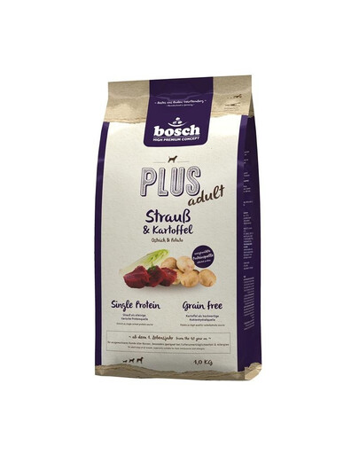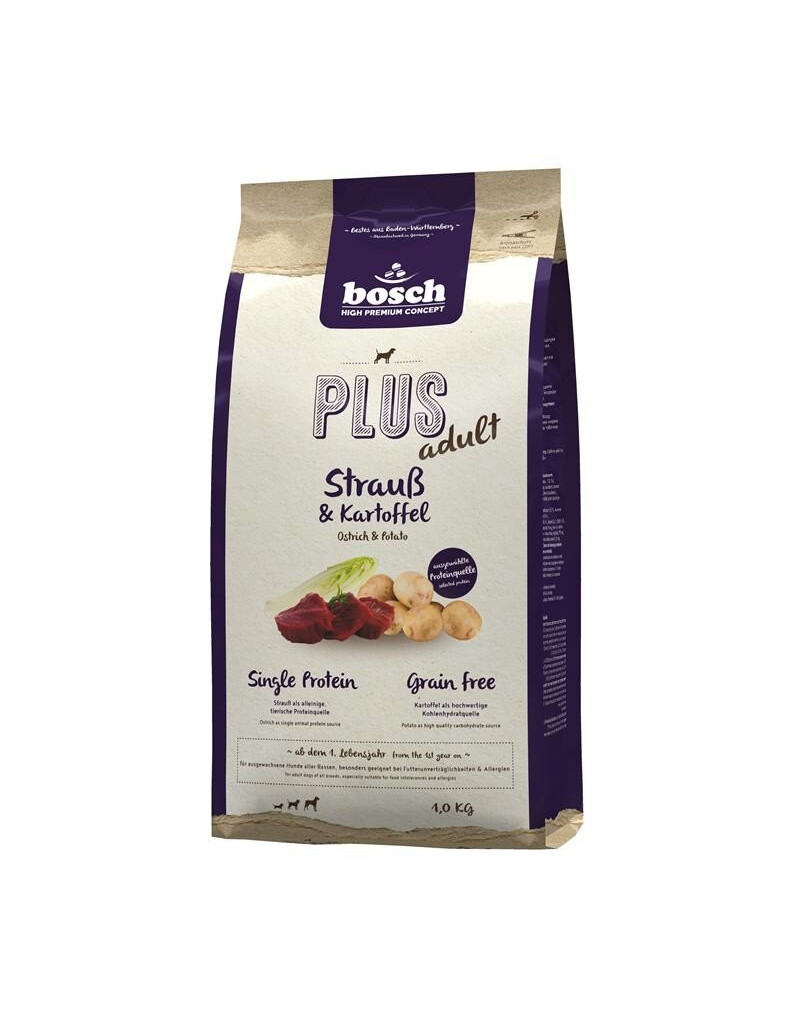 Formule sans céréales à base de pommes de terre et de protéines d'autruche, qui est la seule source de protéines animales. Les granulés semi-humides sont pleins d'arômes et de saveurs, parfaits pour les chiens difficiles. L'autruche et les pommes de terre forment une combinaison unique et facile à digérer. L'ensemble fournit le bon niveau de protéines, et constitue une bonne source de phosphore, de fer, de potassium et de vitamines A, B, E. L'aliment ne contient pas de céréales, de gluten ou de produits laitiers, il est donc mieux digéré et ne fatigue pas le système digestif de l'animal. La chicorée et le yucca ajoutés à la formule régulent la digestion et minimisent les odeurs fécales désagréables. La glucosamine et la chondroïtine renforcent les articulations et le cartilage articulaire, assurant une mobilité correcte.
