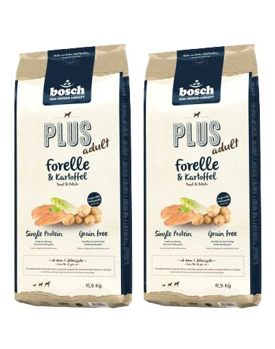 La recette sans céréales est basée sur une seule source de protéines animales, ce qui la rend idéale pour un régime d'élimination. Un tel régime permet d'identifier le facteur allergène. La truite fraîche et en poudre et les pommes de terre constituent une combinaison savoureuse et délicate. Le poisson fournit une forte teneur en acides gras insaturés oméga-3 et - 6, des protéines animales et des graisses facilement digestibles. La truite est recommandée pour l'alimentation des chiens au tube digestif délicat et des chiens souffrant de problèmes de peau. Il contient des vitamines A, D, E, ainsi que du phosphore, du sélénium, du calcium, du magnésium, du fer et du potassium. Les pommes de terre, en tant qu'ingrédient principal de l'aliment, sont une source de glucides. C'est une alternative aux céréales difficiles à digérer, qui peuvent entraver l'absorption de nutriments précieux.