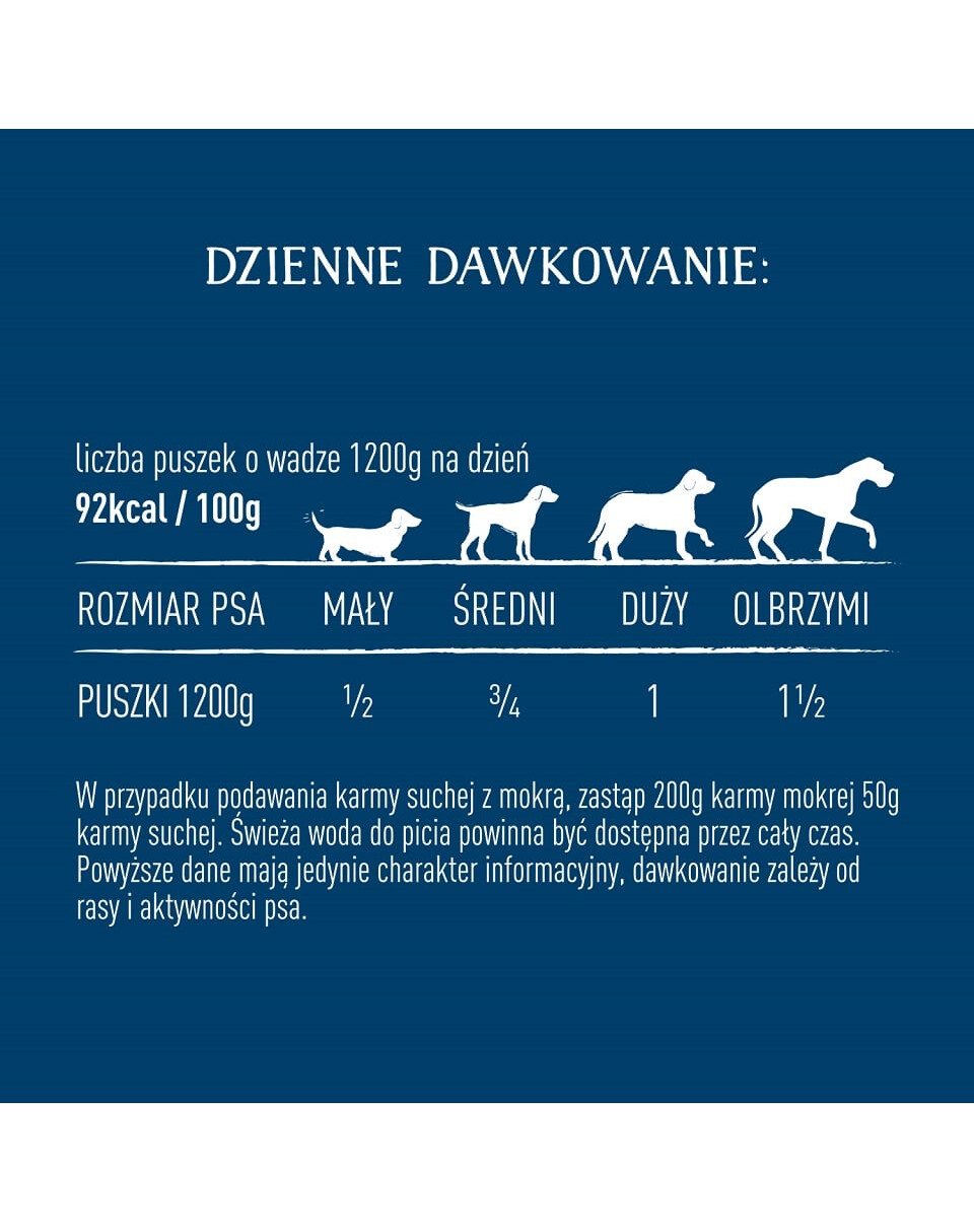 Lorsque vous donnez de la nourriture sèche avec de la nourriture humide, remplacez 200 g de nourriture humide par 50 g de nourriture sèche. De l'eau potable fraîche doit être disponible à tout moment. Les chiffres ci-contre sont donnés à titre indicatif, la posologie dépend de la race et de l'activité.
