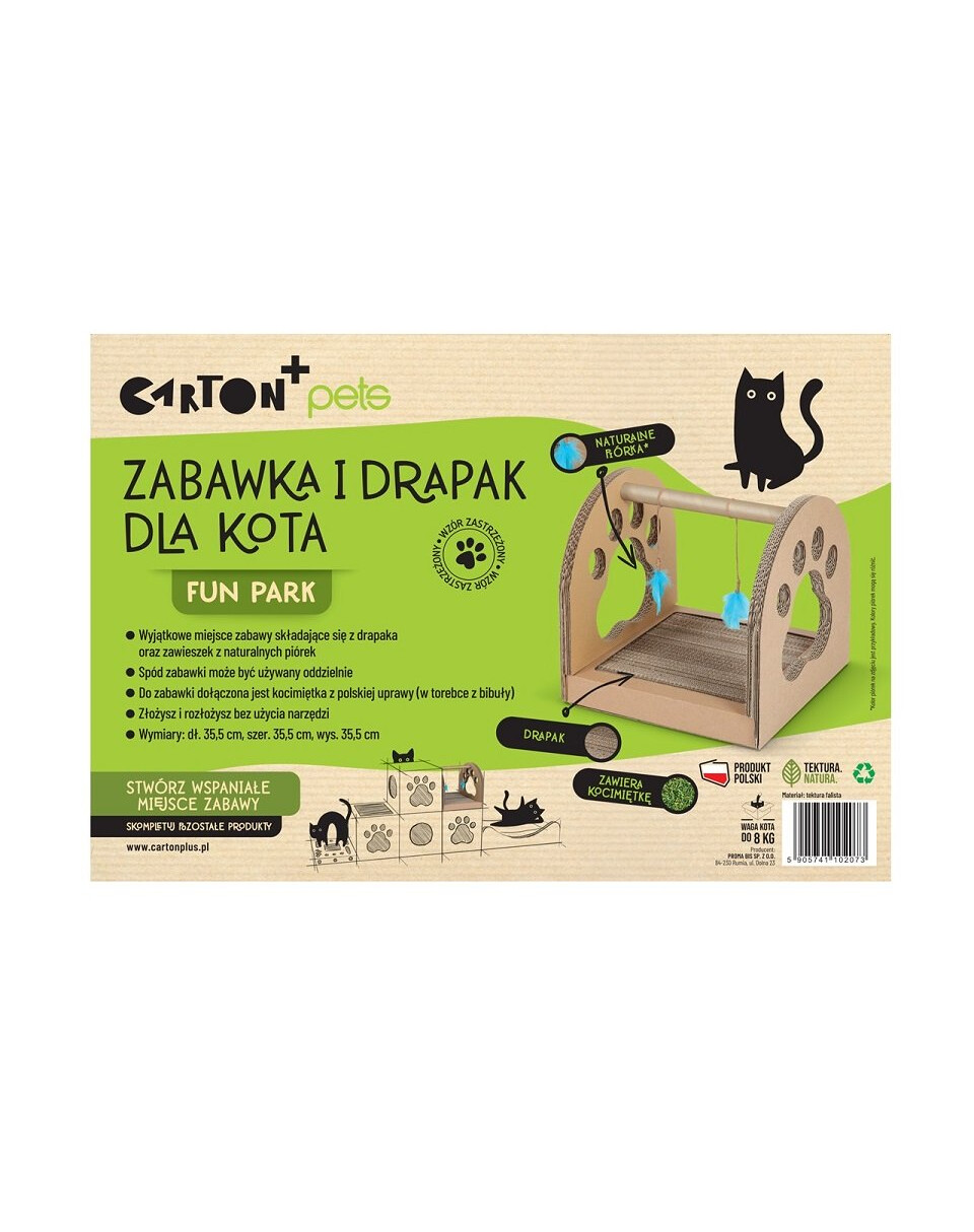 Le kit est livré avec de l'herbe à chat provenant d'une culture polonaise. L'herbe à chat stimule le chat et l'amuse. C'est le seul jouet en carton de ce type sur le marché.
