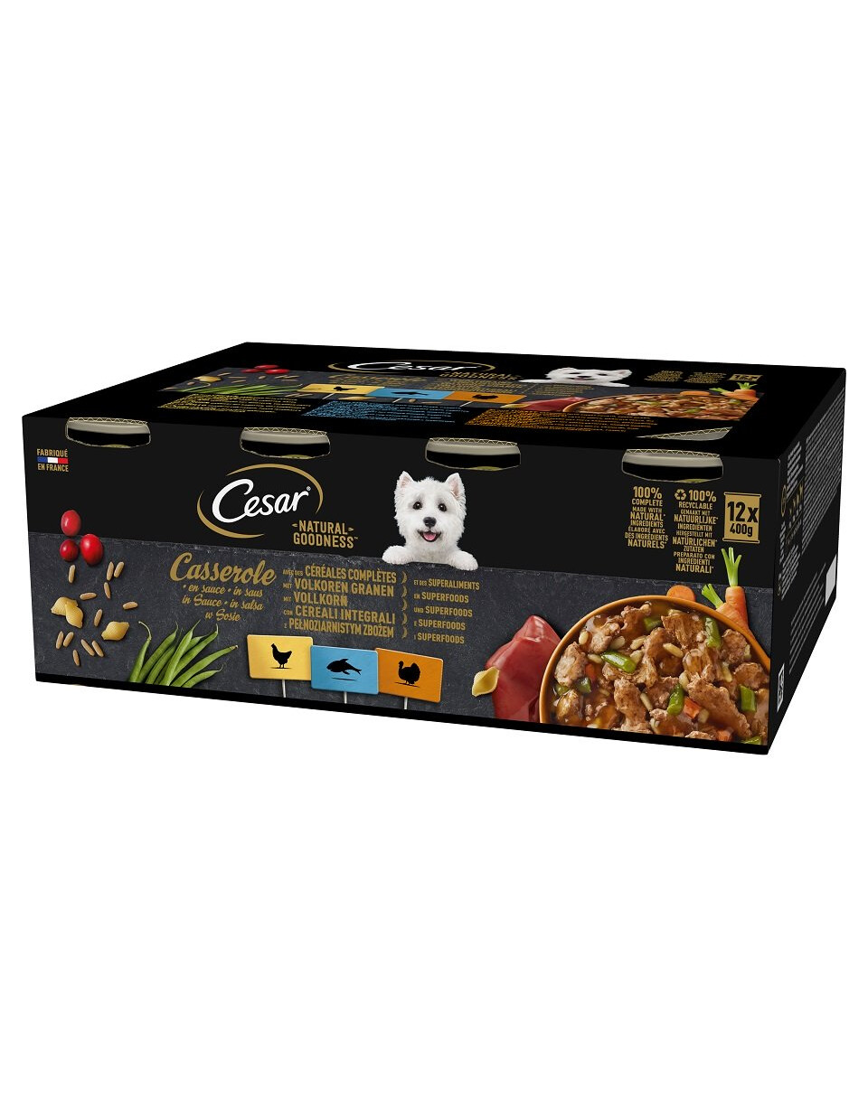 La nourriture pour chiens Cesar Natural Goodness Casserole en sauce avec des céréales complètes a été préparée selon une recette soigneusement sélectionnée qui fournit aux chiens tout ce dont ils ont besoin chaque jour. L'aliment est riche en protéines, avec l'ajout de légumes nutritifs et d'herbes aromatiques. Cet aliment est idéal pour un repas quotidien frais et délicieux. Vous pouvez le servir avec des aliments secs ou comme plat indépendant. Cet aliment est présenté dans une sauce savoureuse et en trois variantes : avec du poulet, garni de carottes, de pâtes complètes et de pommes ; avec du poisson blanc, garni de haricots verts, de carottes, de riz complet et d'huile de poisson ; avec de la dinde, garnie de patates douces, de haricots verts, de riz complet et de canneberges. L'aliment contient de l'extrait de chicorée, qui est une source naturelle de prébiotiques. Les aliments pour chiens Cesar Natural Goodness Casserole ont été préparés pour conserver leur valeur nutritionnelle naturelle et leur goût délicieux. Des nutritionnistes et des vétérinaires du WALTHAM Institute of Animal Science ont participé à son développement.