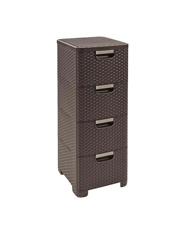 Elle dispose de quatre tiroirs spacieux avec poignées, qui sont durables et, surtout, très faciles à nettoyer. Cette bibliothèque est idéale pour une utilisation dans la salle de bains, la chambre à coucher ou comme contenant de bureau. Le matériau de haute qualité dont il est fait rappelle dans sa structure le rotin populaire, qui s'intègre parfaitement à tout type de décoration intérieure.