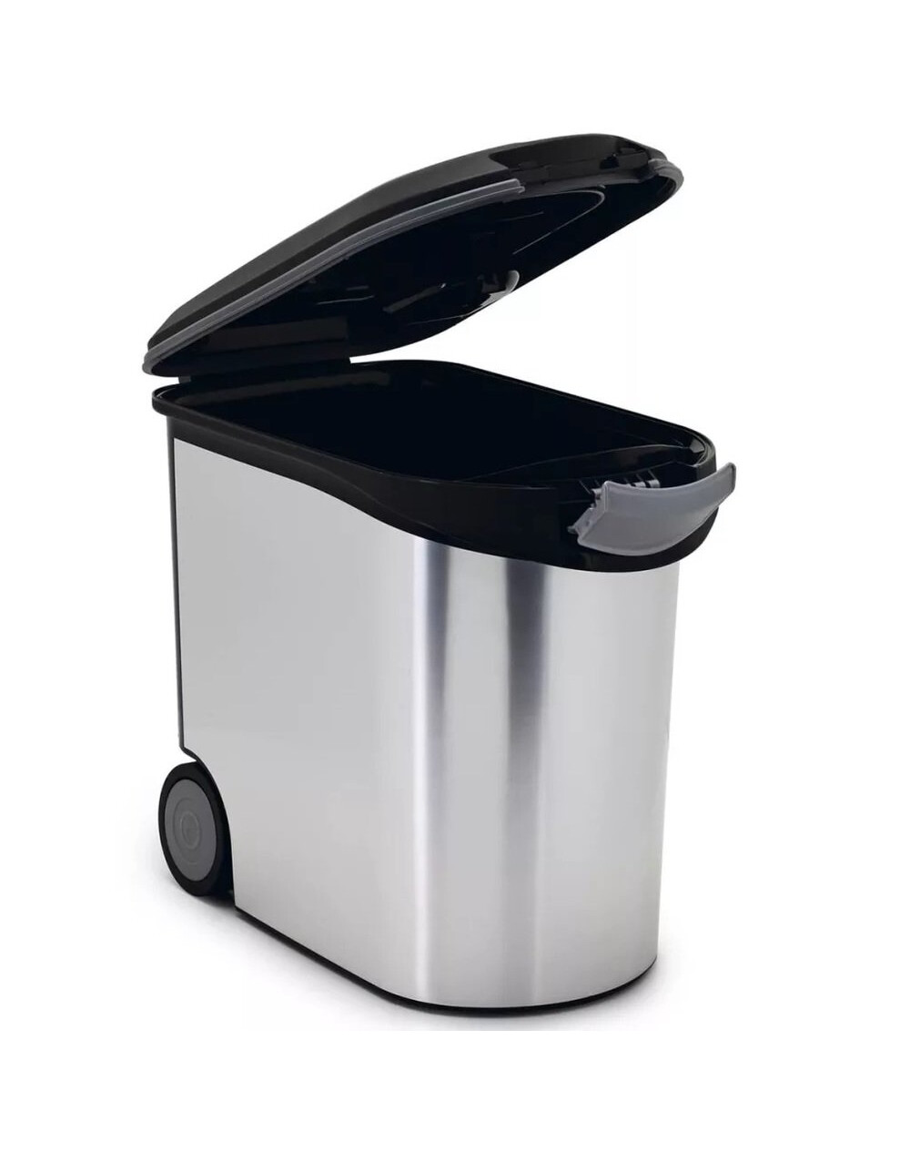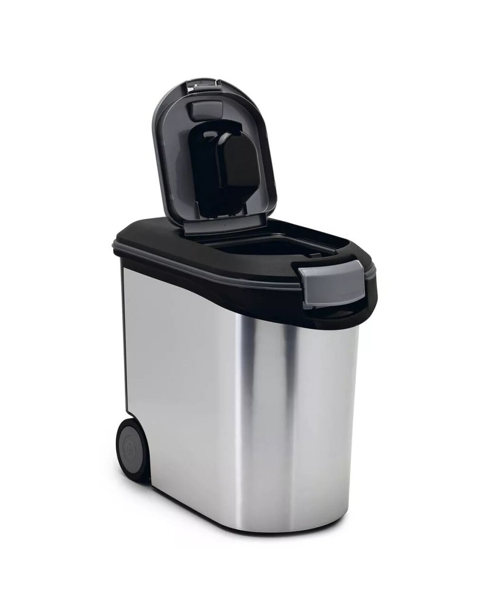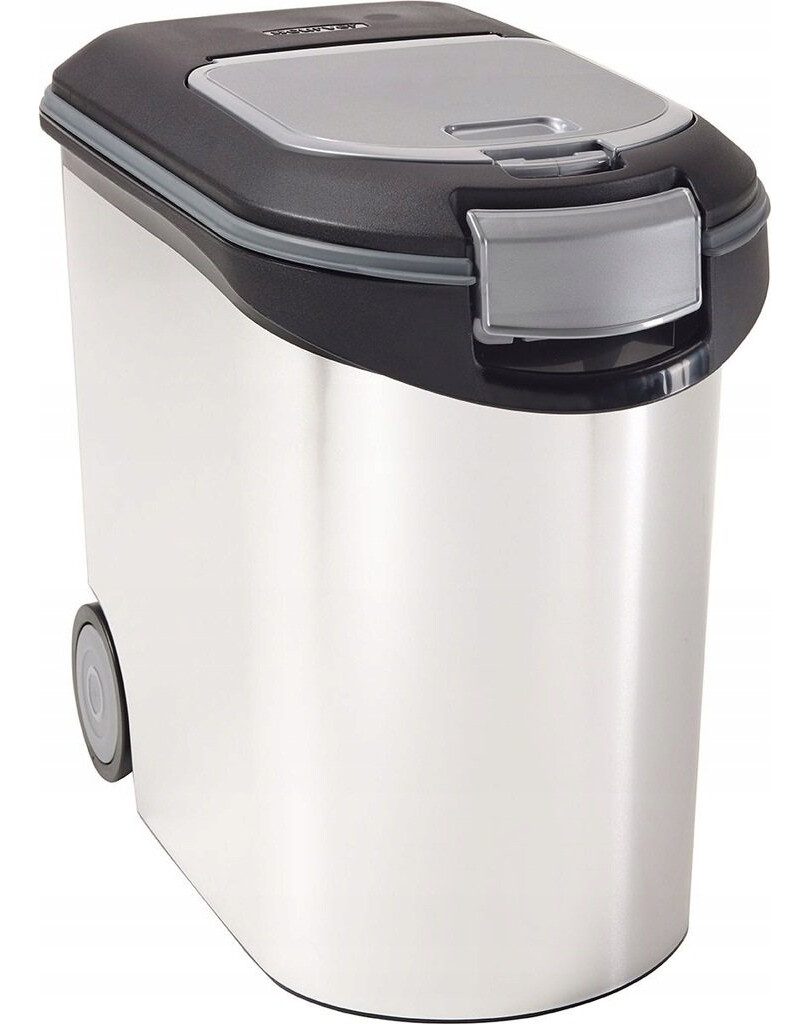 La grande capacité - jusqu'à 35 litres de nourriture - implique un poids considérable, mais les roues rendent le conteneur beaucoup plus facile à manœuvrer.
