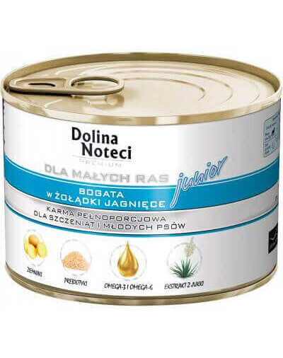 Nourriture humide pour chiots et jeunes chiens de petites races, riche en estomac d'agneau.