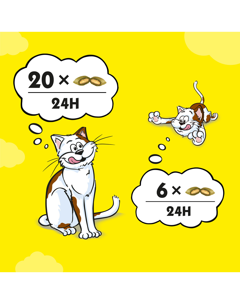 Pour les chats adultes, donnez jusqu'à 20 pièces par jour. Pour les chatons, donnez jusqu'à 6 morceaux par jour. La dose du repas principal doit être réduite en conséquence. Conserver dans un endroit sec et frais. Une fois ouvert, conservez l'emballage bien fermé et utilisez-le dans les 4 semaines. N'oubliez pas de fournir à votre animal un accès constant à de l'eau fraîche pour boire.