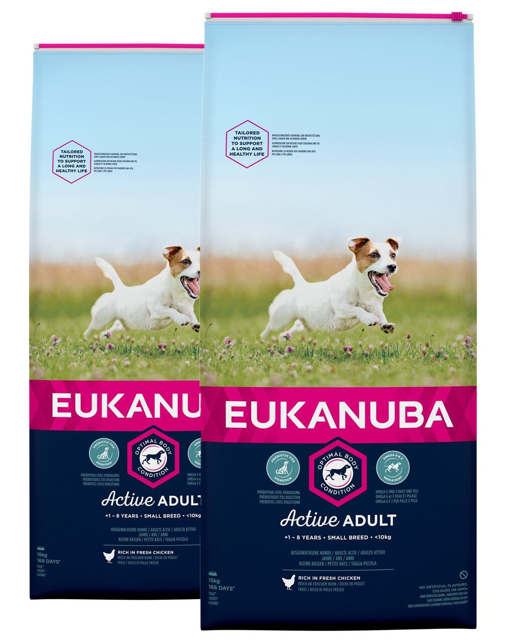 La nouvelle recette améliorée d'EUKANUBA est adaptée au stade de vie du chien. L'aliment complet à 100 % pour chiens adultes (Active Adult) de petites races âgés de 1 à 8 ans fournit une nutrition qui favorise une condition corporelle optimale (condition corporelle optimale).