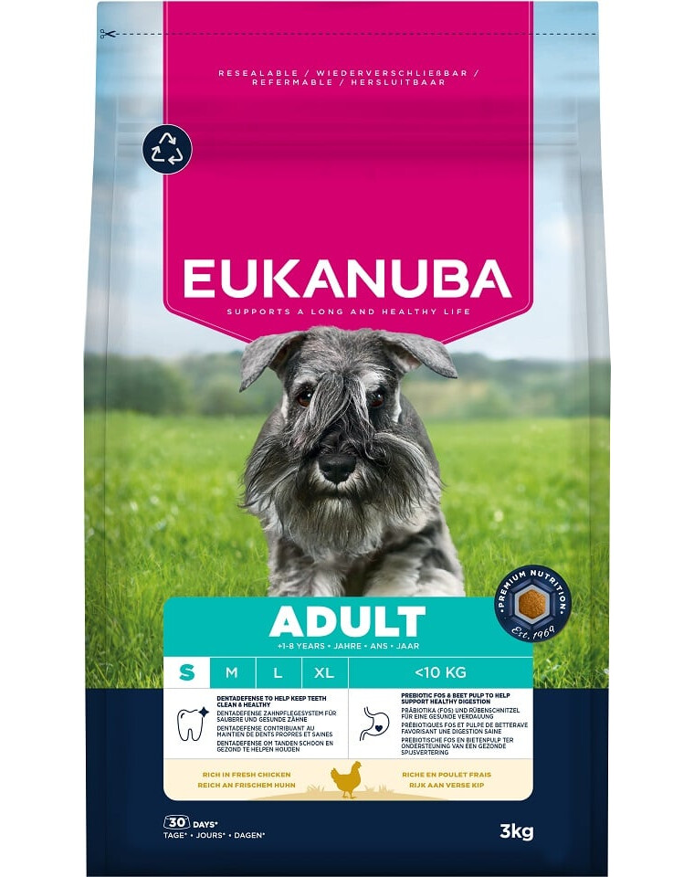La nourriture sèche EUKANUBA pour chiens adultes, riche en poulet frais, est 100% complète et équilibrée et idéale pour les petites races âgées de 1 à 8 ans.