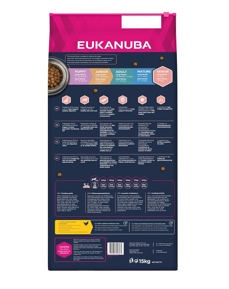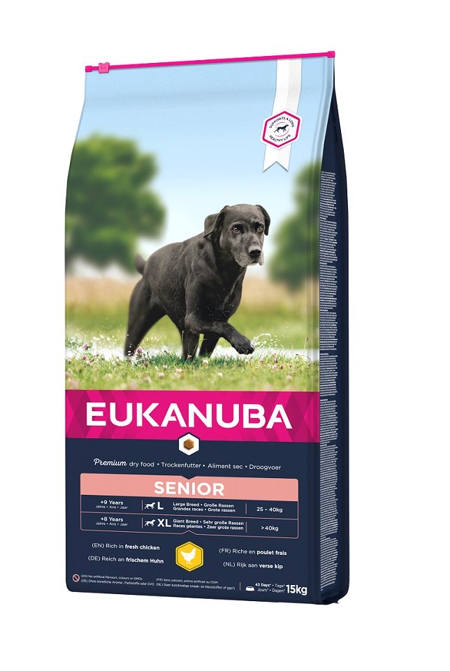 La nouvelle recette améliorée d'EUKANUBA est adaptée au stade de vie du chien. L'aliment senior complet à 100 % (Caring Senior) pour les grandes races âgées de 9 ans et plus fournit une nutrition favorisant une condition corporelle optimale (condition corporelle optimale) et l'activité.