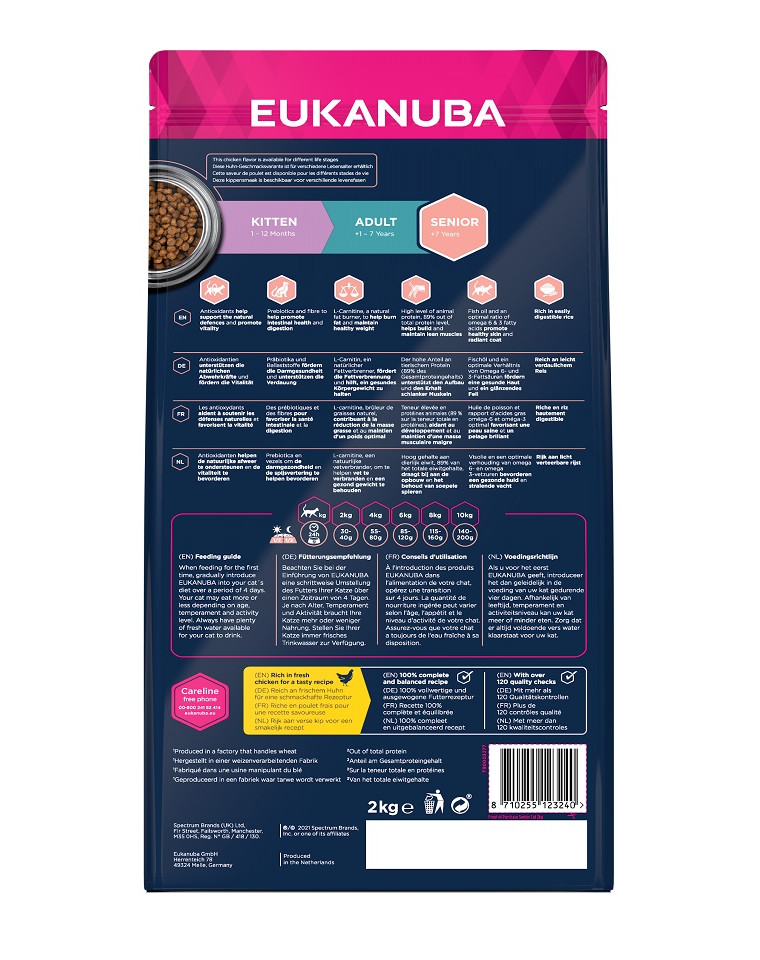 Les croquettes EUKANUBA pour chats âgés sont 100% completes et équilibrées. Les protéines de ce savoureuse nourriture riche en poulet frais sont jusqu'à 89 % d'origine animale, ce qui favorise le développement et le maintien des muscles non gras. Cette nourriture est sans blé*, mais contient une forte proportion de riz facilement digestible pour aider à maintenir les fonctions corporelles clés et améliorer la vitalité des chats vieillissants. L'ajout d'antioxydants améliore l'immunité naturelle et la vitalité. La L-carnitine favorise la combustion des graisses et le maintien du poids. Le rapport optimal entre les acides gras oméga-6 et oméga-3 et l'huile de poisson garantit une peau saine et un pelage brillant. EUKANUBA pour chats âgés sont des croquettes savoureuses sans arômes ni colorants artificiels ni OGM.
