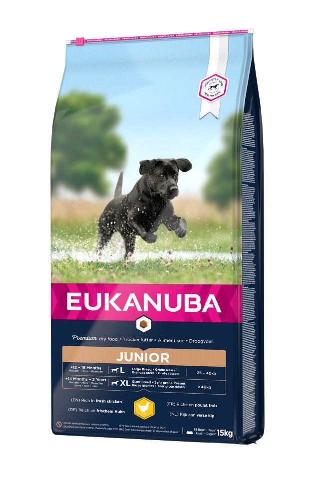 Les aliments secs EUKANUBA sont riches en poulet frais et sont idéaux pour les chiens de grande race en pleine croissance âgés de 12 à 18 mois (14 mois à 2 ans pour les races géantes). Les ingrédients soigneusement sélectionnés garantissent que l'alimentation est adaptée aux besoins de croissance et de développement du chien en devenir. Les aliments EUKANUBA Junior Grandes Races contiennent des acides DHA qui favorisent l'acuité mentale et la capacité d'apprentissage des chiots. Un mélange spécial de prébiotiques FOS et MOS et de pulpe de betterave favorise une digestion saine. Cet aliment contient également des vitamines E et C, une source d'antioxydants qui renforcent le système immunitaire, et du calcium qui favorise le développement des os. Cet aliment contient également des sources naturelles d'acides oméga-6 et oméga-3 pour une peau saine et un pelage brillant. La forme hexagonale spéciale des granulés et le système unique DentaDefense contribuent à garder les dents saines et propres. L'alimentation est 100% complète et équilibrée. L'action nutritionnelle avancée pour les chiens de grande race en pleine croissance se traduit par une condition optimale et un bien-être tout au long de la vie.