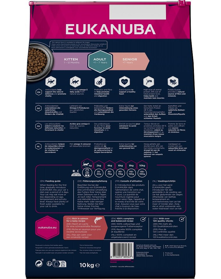 La formule riche en saumon fournit des acides gras oméga-3 d'origine naturelle. Nous avons ajouté une dose supplémentaire de taurine à la formule pour soutenir la santé cardiaque. Les pommes de terre et les pois, sources alternatives d'hydrates de carbone, constituent une source naturelle de fibres et de minéraux. De plus, la levure incluse est une source naturelle de vitamines et d'acides aminés essentiels. Tous ces ingrédients sont importants pour la santé du chat adulte et contribuent activement à son bien-être tout au long de sa vie.
