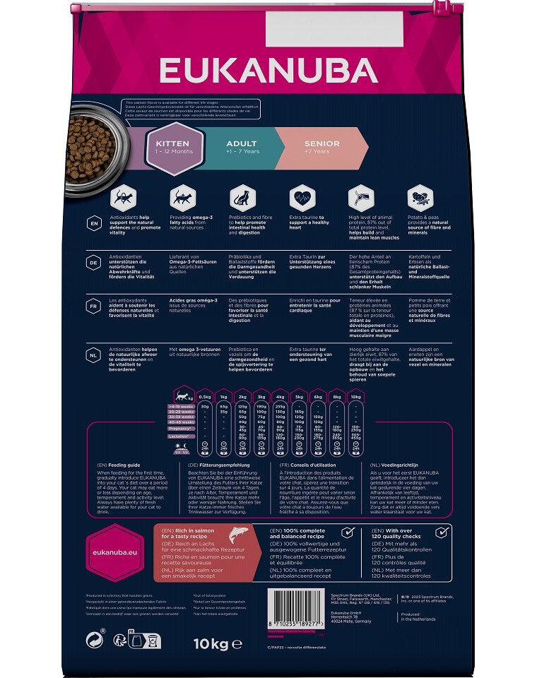 La formule riche en saumon fournit des acides gras oméga-3 provenant de sources naturelles. Pour favoriser un cœur sain, nous avons ajouté une portion supplémentaire de taurine à la formule. Cette nourriture contient beaucoup de prébiotiques et de fibres pour favoriser la santé intestinale et la digestion. Les pommes de terre et les pois, sources alternatives d'hydrates de carbone, constituent une source naturelle de fibres et de minéraux. En outre, la levure contenue dans cette nourriture est une source naturelle de vitamines et d'acides aminés essentiels. Tous ces ingrédients sont essentiels pendant la phase de croissance de votre chaton et contribuent activement à un départ sain dans la vie.