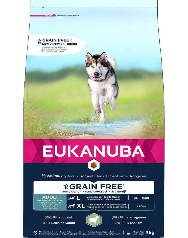 EUKANUBA Grain Free dry food riche en agneau frais congelé pour les chiens adultes de grandes races et de races géantes favorise le maintien de muscles non gras.