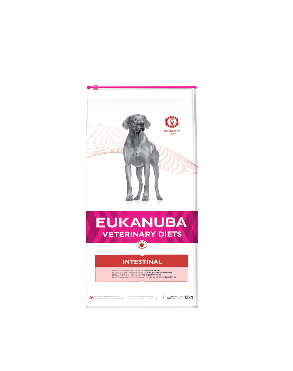 EUKANUBA Veterinary Diets Intestinal pour chiens aide à prendre soin de l'appareil digestif grâce à des ingrédients hautement digestibles, à une faible teneur en matières grasses et à un mélange spécial de fibres.