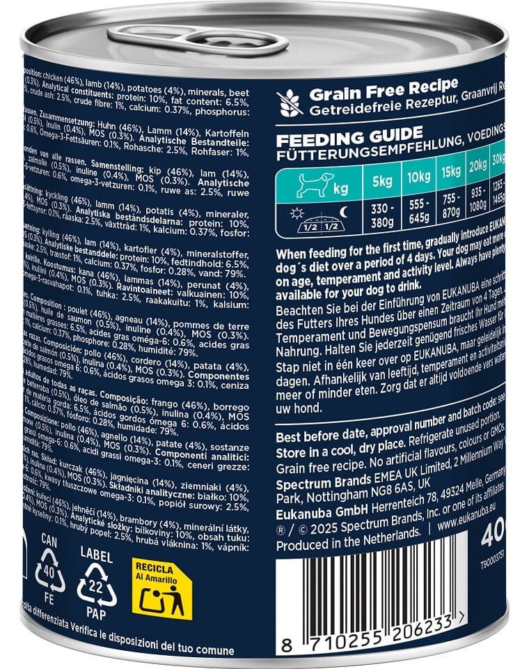 Ingrédients: poulet (46%), agneau (14%), pommes de terre (4%), minéraux, pulpe de betterave (0.5%), huile de saumon (0.5%), inuline (0.4%), MOS (0.3%).