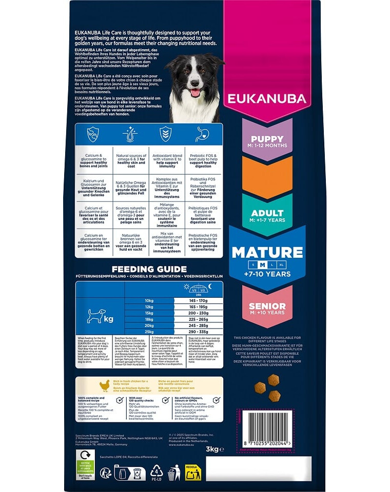 EUKANUBA Life Care est une gamme de nourritures premium développée sur la base de recherches scientifiques pour fournir aux chiens des nutriments adaptés à leurs besoins changeants à chaque étape de leur vie. Cette recette a été spécialement conçue pour les chiens matures de races moyennes âgés de 7 à 10 ans, qui nécessitent un régime soutenant un vieillissement sain, la vitalité et le maintien d'une condition optimale.
