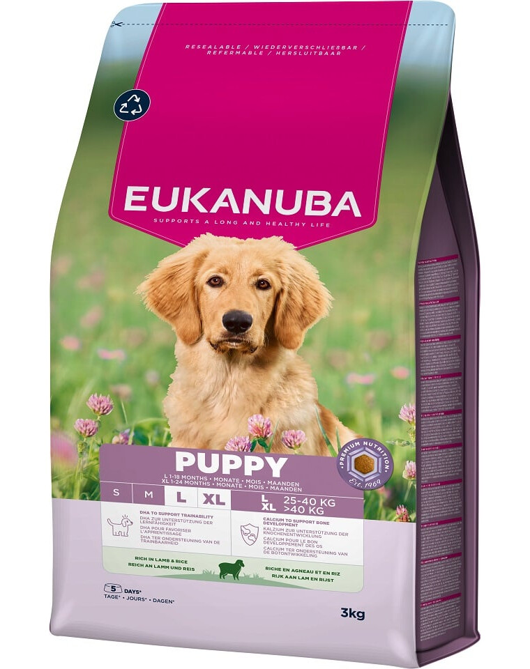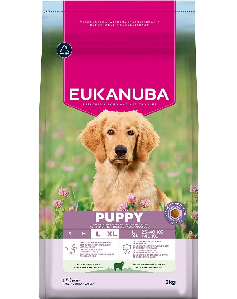 Cette nourriture sèche EUKANUBA pour chiots, riche en agneau et en riz, est 100% complète et équilibrée et idéale pour les grandes races âgées de 1 à 18 mois (et jusqu'à 24 mois pour les races géantes).