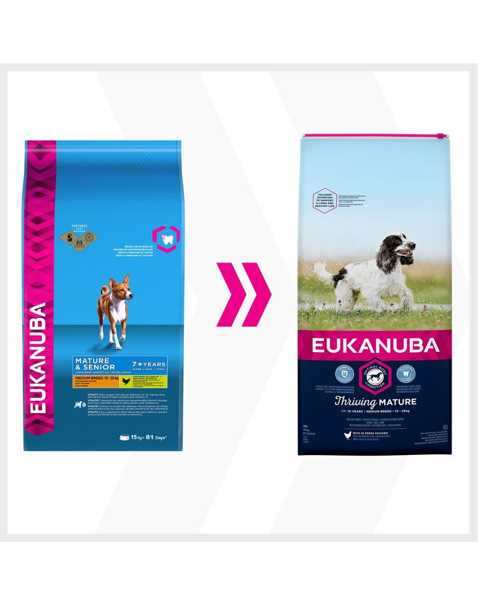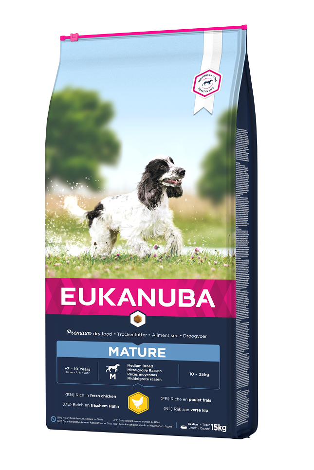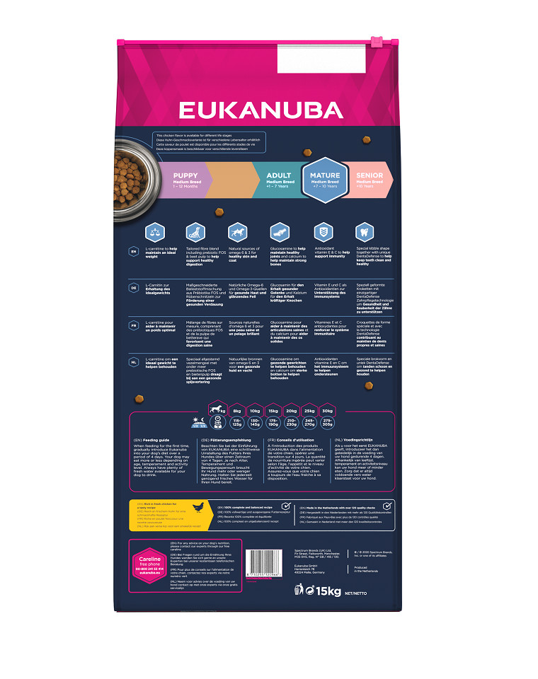Les aliments secs EUKANUBA sont riches en poulet et sont idéaux pour les chiens adultes de race moyenne âgés de 7 à 10 ans. Des ingrédients soigneusement sélectionnés fournissent une nutrition adaptée aux besoins d'un chien adulte. La L-carnitine contenue dans l'aliment favorise la réduction des graisses, ce qui favorise le maintien du poids et réduit le stress sur les articulations. Un mélange spécial de prébiotiques FOS et de pulpe de betterave favorise une digestion saine. Cet aliment contient également des sources naturelles d'acides oméga-6 et oméga-3 pour une peau saine et un pelage brillant. L'ajout de glucosamine favorise la santé des articulations, tandis que le calcium est bénéfique pour les os. De son côté, l'ajout de vitamine E et C, source d'antioxydants, renforce le système immunitaire. La forme hexagonale spéciale des granulés et le système unique DentaDefense contribuent à garder les dents saines et propres. L'alimentation est 100% complète et équilibrée. L'action nutritionnelle avancée pour les chiens matures de race moyenne se traduit par une condition optimale et un bien-être tout au long de la vie.