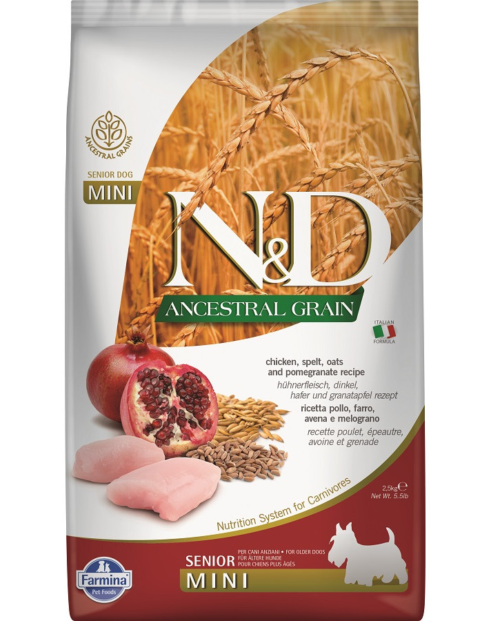 La recette contient une petite quantité de céréales - dites "céréales ancestrales" - avoine et épeautre (10% chacun). L'ingrédient principal est le poulet frais et séché, auquel s'ajoute du hareng. L'ensemble de ces éléments garantit un niveau élevé de protéines animales, ce qui favorise une masse musculaire suffisante et une bonne condition physique. La recette est complétée par des fruits, des légumes et des herbes. La grenade est un fruit prisé qui possède de nombreuses propriétés bénéfiques pour la santé. Il est considéré comme un fruit anti-tumeur cellulaire et possède des propriétés de soutien cardiaque et cérébral. La glucosamine et la chondroïtine sont nécessaires au maintien de la santé des articulations et des os. La nourriture a un faible indice glycémique, elle procure donc une sensation de satiété plus longue et prévient les excès d'appétit.