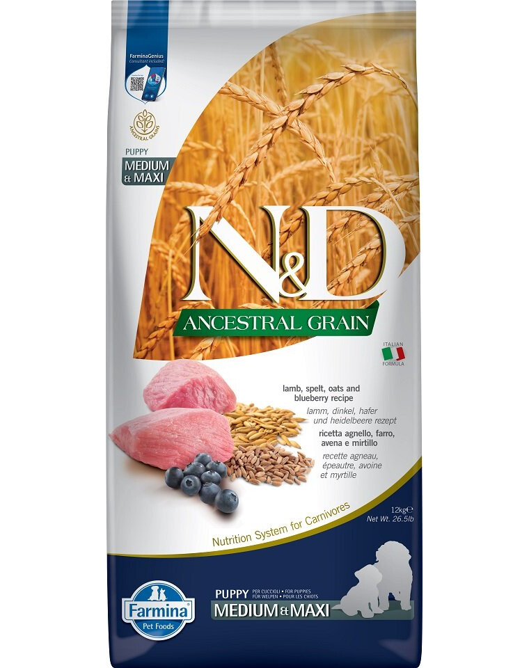 FARMINA N&D Low Grain Medium & Maxi Lamb & Blueberry Puppy - Faible teneur en céréales, agneau et myrtilles pour chiots de tailles moyennes et grandes - 12 kg