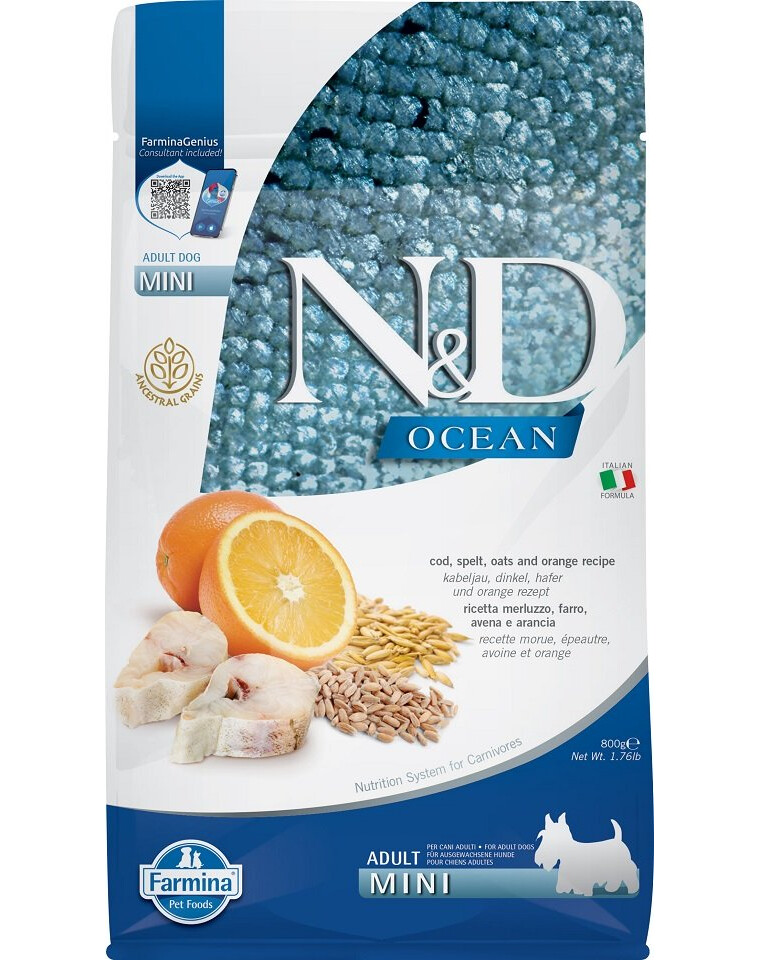 FARMINA N&D Ocean Adult Mini codfish, spelt, oats, orange 800 g - Morue, épautre, avoine & Orange pour chiens adultes de petite race