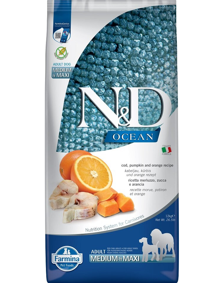 La nourriture contient des protéines animales provenant uniquement du poisson. La morue fraîche et séchée représente jusqu'à 50 % de la recette totale, ce qui garantit une croissance et un développement sains et une bonne condition du chien. Les additifs de cette nourriture sont les oranges et le potiron, qui ont complètement remplacé les céréales. Ils fournissent une grande quantité de vitamines, principalement C, de fibres et de minéraux. Les céréales, difficiles à digérer et mal tolérées par les chiens, ont été remplacées par le potiron, qui a un faible indice glycémique. Le potiron est riche en vitamine A et en antioxydants, elle soutient les systèmes immunitaire et cardiovasculaire, et a des effets anti-inflammatoires et anti-parasitaires. L'huile de poisson est une dose puissante d'acides gras insaturés oméga 3 qui ont des propriétés anti-inflammatoires. L'ajout de curcuma a des propriétés antioxydantes et anticancéreuses.