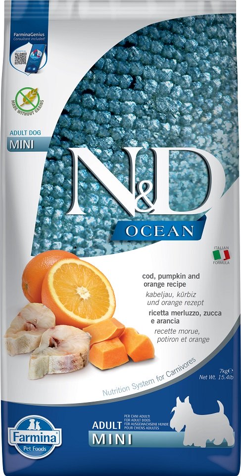 morue fraîche (25%), morue séchée (25%), amidon de pois, huile de poisson (de hareng), potiron séché (5%), fibres de pois, carotte séchée, luzerne séchée, inuline, fructooligosaccharides, extrait de levure (source de mannanoligosaccharides), orange douce séchée (0.5%), pomme séchée, fruit de la grenade séché, épinards séchés, plantain (0,3%), myrtilles séchées, chlorure de sodium, levure de bière séchée, racine de curcuma (0,2%), glucosamine, sulfate de chondroïtine.