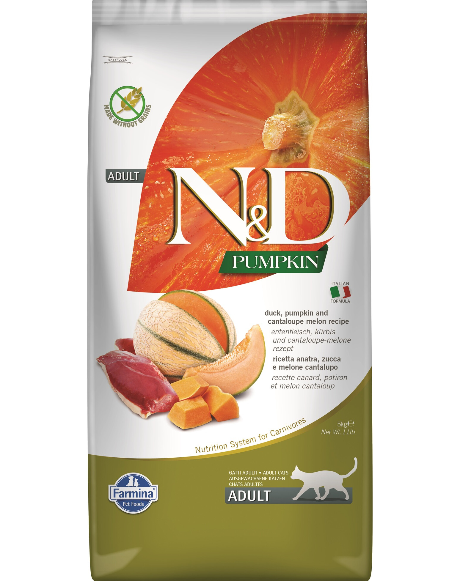 Viande fraîche de canard (30%), viande séchée de canard (28%), amidon de pois, graisse de poulet, potiron séché (5%), œufs entiers séchés, hareng frais, hareng séché, huile de poisson (de hareng), carottes séchées, luzerne séchée, inuline, fructooligosaccharides, extrait de levure (source de mannanoligosaccharides), melon Cantaloup séché (0.5%), grenade séchée, pomme séchée, épinards séchés, psyllium (0,3%), orange douce séchée, myrtilles séchées, chlorure de sodium, levure de bière séchée, curcuma (0,2%), glucosamine, sulfate de chondroïtine.