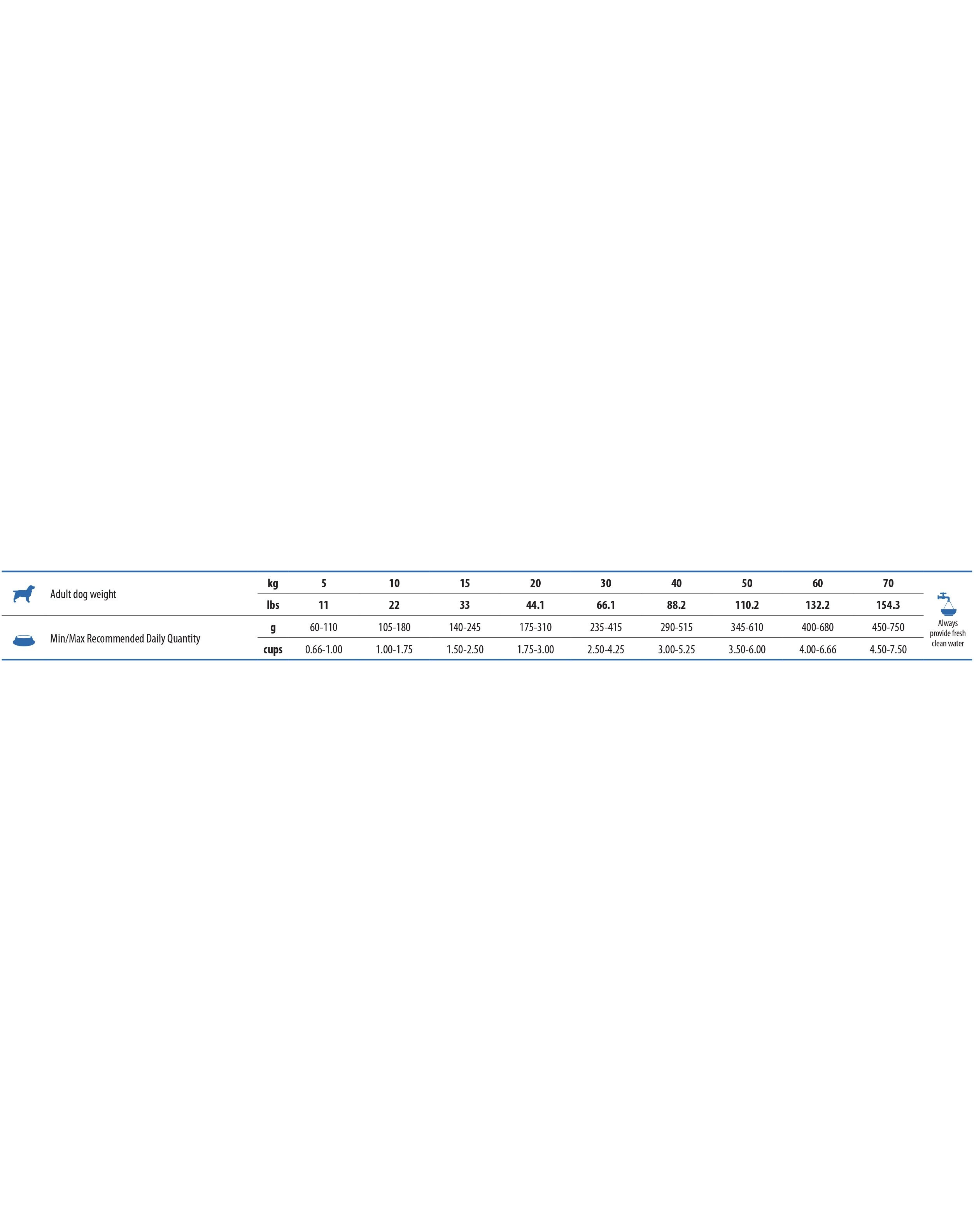 Protéines brutes 23,00 % ; matières grasses brutes 12,00 % ; fibres brutes 2,80 % ; humidité 9,00 % ; cendres brutes 7,90 % ; calcium 1,10 % ; phosphore 0,90 % ; acides gras oméga-3 0,40 % ; acides gras oméga-6 2,20 % ; DHA 0,20 % ; EPA 0,10 % ; glucosamine 1200mg/kg ; sulfate de chondroïtine 900mg/kg.