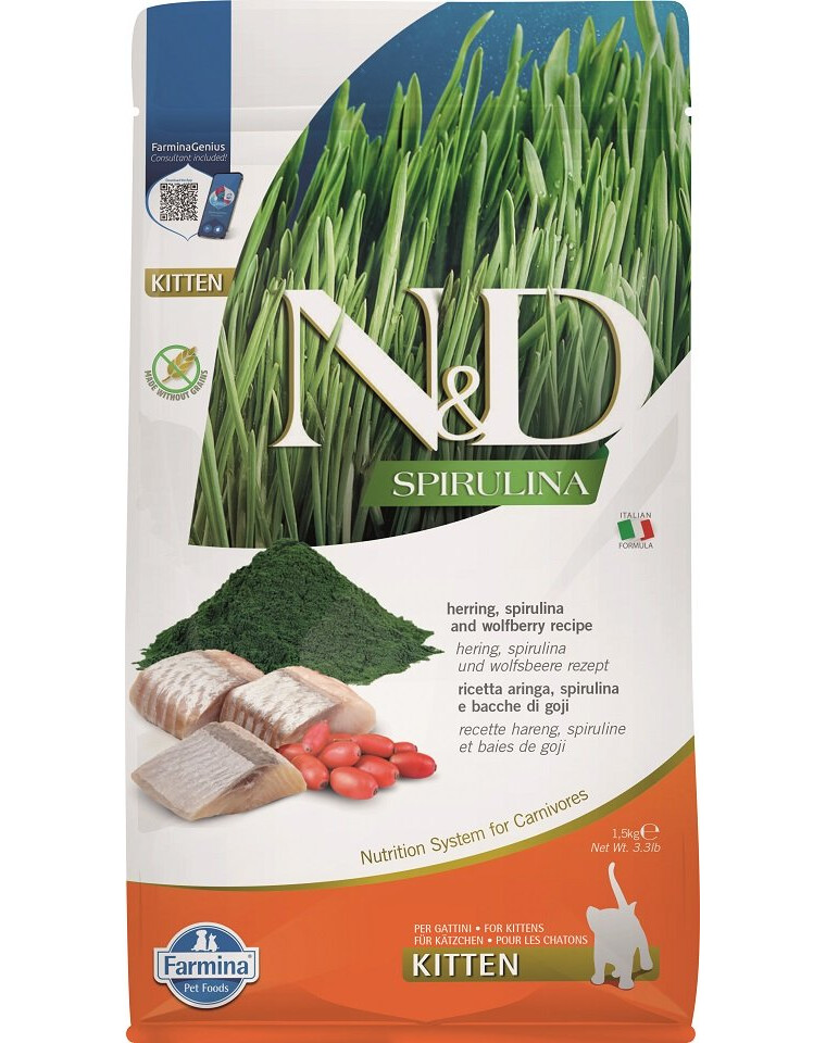 FARMINA N&D Spirulina Kitten Herring & Wolfberry - 1,5 kg - pour chatons avec hareng, spiruline et baies de Goji