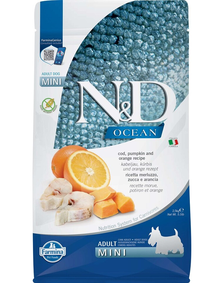 Morue fraîche (25%), morue séchée (25%), amidon de pois, huile de poisson (de hareng), potiron séché (5%), fibres de pois, carottes séchées, luzerne séchée, inuline, fructooligosaccharides, extrait de levure (source de mannanoligosaccharides), orange douce séchée (0.5%), pomme séchée, fruit de la grenade séché, épinards séchés, plantain (0,3%), myrtilles séchées, chlorure de sodium, levure de bière séchée, racine de curcuma (0,2%), glucosamine, sulfate de chondroïtine.