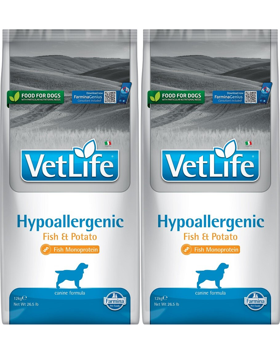 Farmina Vet Life Hypoallergenic poisson & pommes de terre est une nourriture diététique complète pour les chiens dans la réduction des intolérances aux ingrédients et aux nutriments ; le soutien de la fonction de la peau dans les cas de dermatose et de perte excessive de poils.