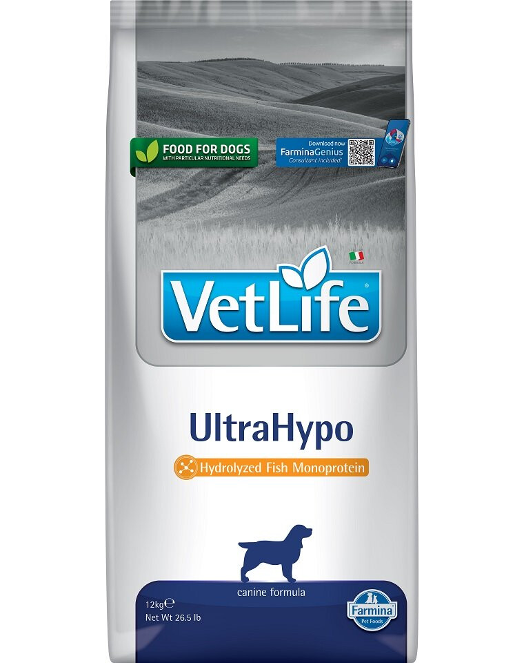 Farmina Vet Life UltraHypo est une nourriture diététique complète (hydrolysat) pour les chiens dans la réduction de l'intolérance aux ingrédients et aux substances alimentaires ; régime d'élimination ; soutien de la fonction de la peau en cas de dermatose et de perte excessive de poils.