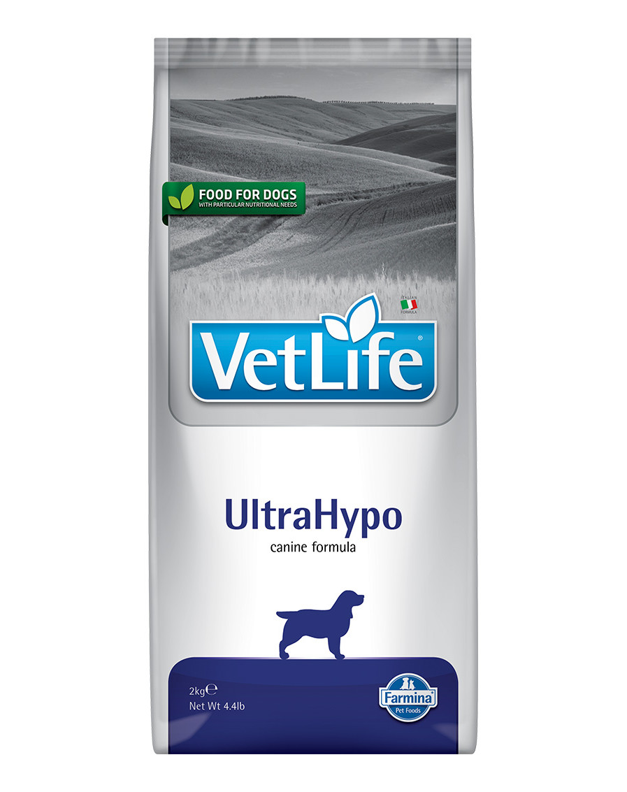 Farmina Vet Life UltraHypo est une nourriture diététique complète (hydrolysat) pour les chiens dans la réduction de l'intolérance aux ingrédients et aux substances alimentaires ; régime d'élimination ; soutien de la fonction de la peau en cas de dermatose et de perte excessive de poils.