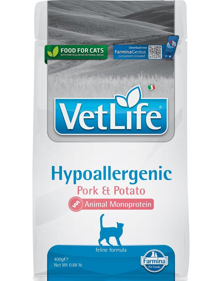 FARMINA VetLife Hypoallergenic Adult Pork 400 g - porc & pomme de terre nourriture diététique pour chats adultes réduit les intolérances aux ingrédients